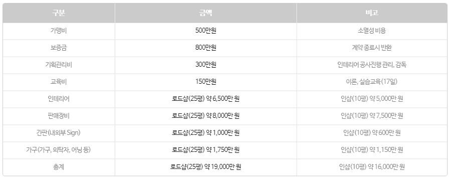초기에 투자되는 비용은 아래와 같습니다. (부가세별도) 기본적으로 가맹비 500만원, 계약종료시 돌려받을 수 있는 보증금은 800만원, 기획관리비, 교육비가 들어가고 인테리어 비용이 25평 로드샵 기준으로 6,500만원이 들어가게 됩니다.